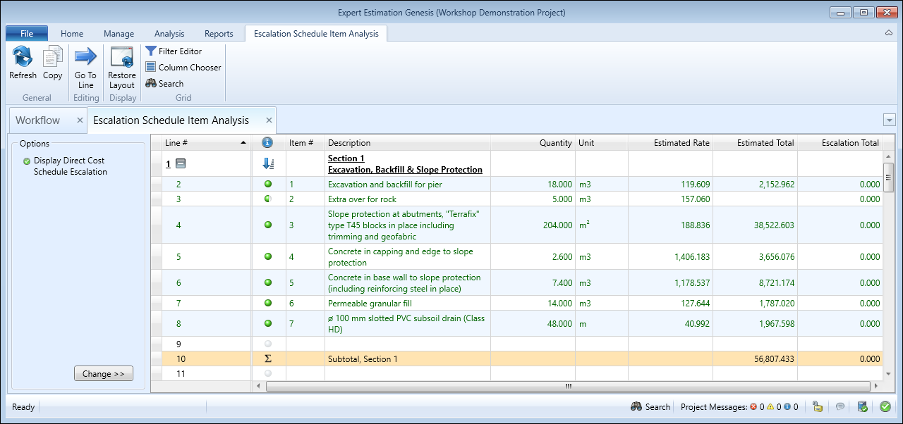 By default, the analysis will display the Estimated Value of the Direct Cost Schedule with the Total Escalated Value for each item. The escalation value per Resource Type can be shown by adding Resource Type specific columns from the Column Chooser.