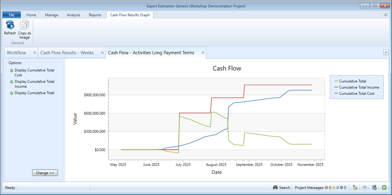 This adds a new data point to the Cash Flow Results Graph, displaying the distribution of the Project’s Total Cost over time. |