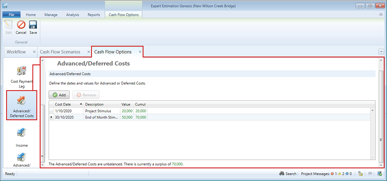 Note: Value added as an Advanced/Deferred Cost represents a lump sum to a Cash Flow scenario and does not relate to the overall Project or Resource Type Totals for a project.