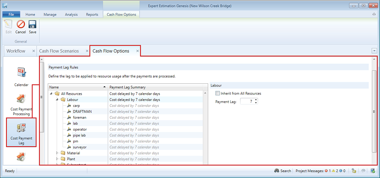 Example: In a Cash Flow Scenario with a 5 Day Week Calendar, with a Resource used on a Wednesday with a 5 Day Cost Payment Lag, the cost is not incurred until the following Monday.