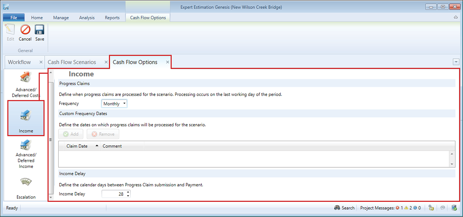 This section in the Cash Flow Scenario Options – Income window allows you to define the duration between when a progress claim is made and when it is actually paid.