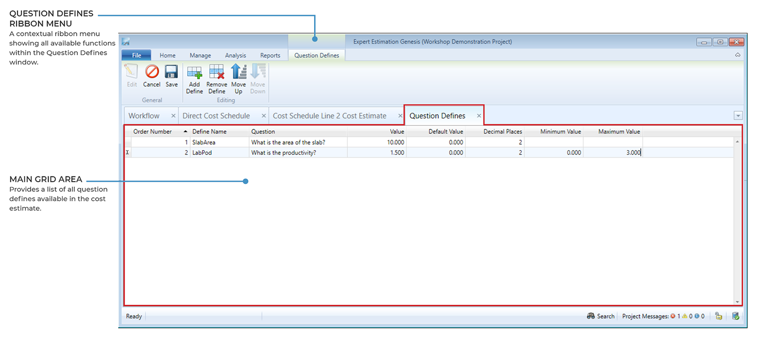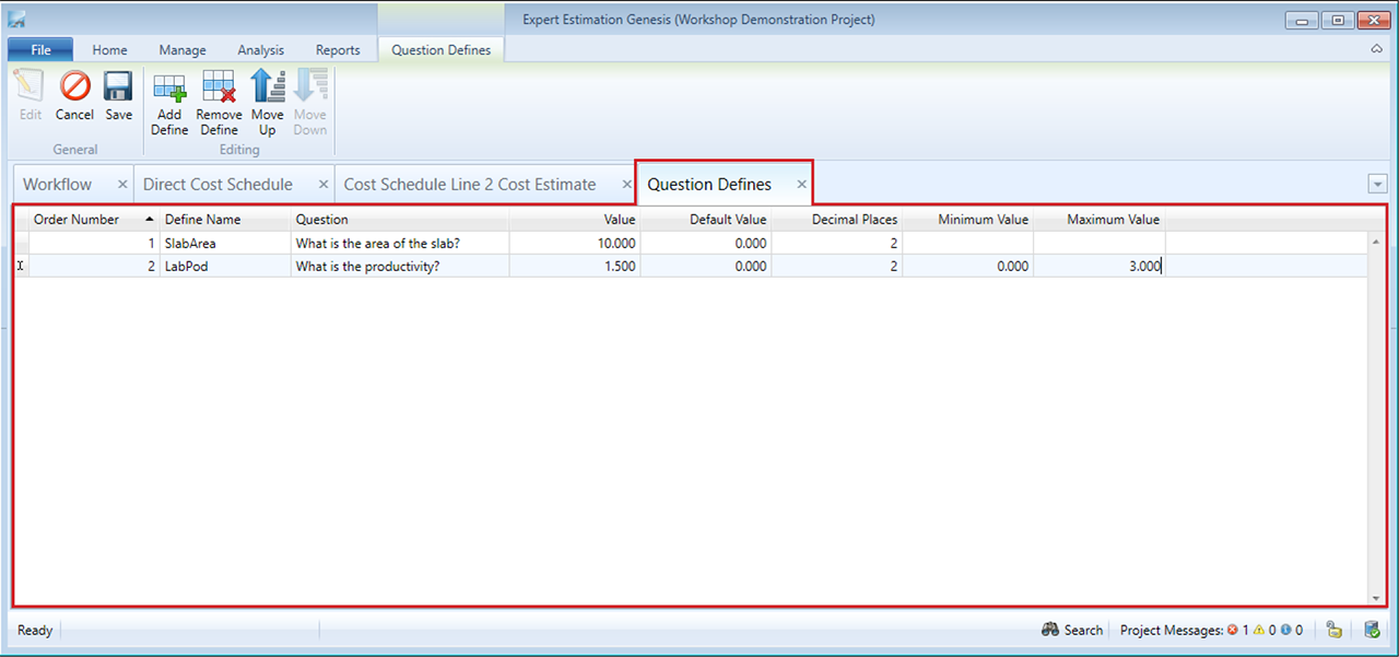 Note: The name of a question define must be unique for each cost estimate.