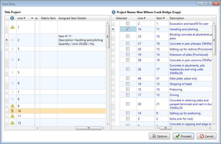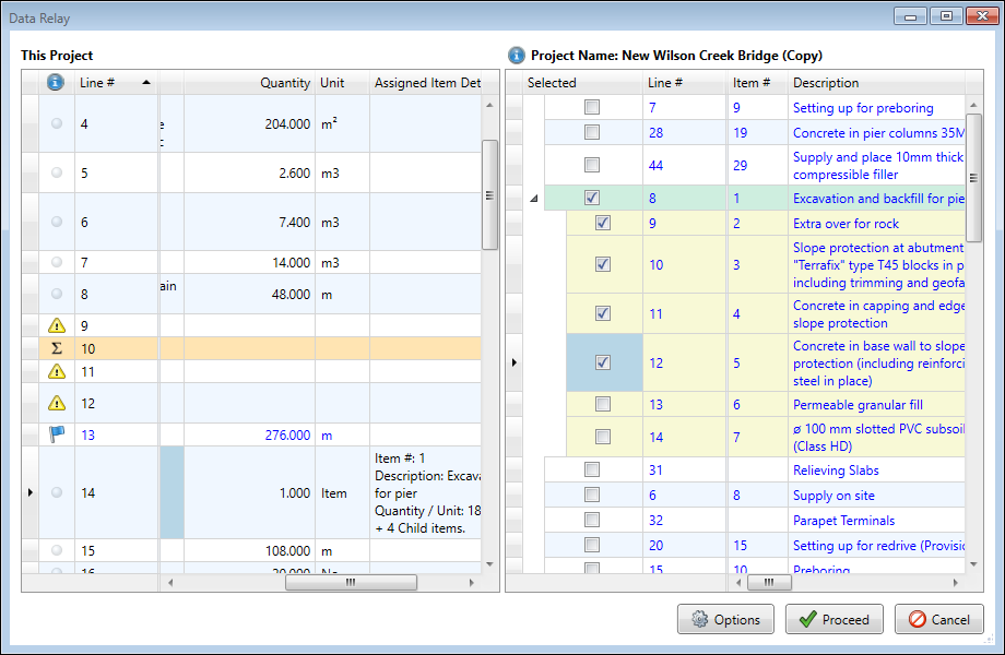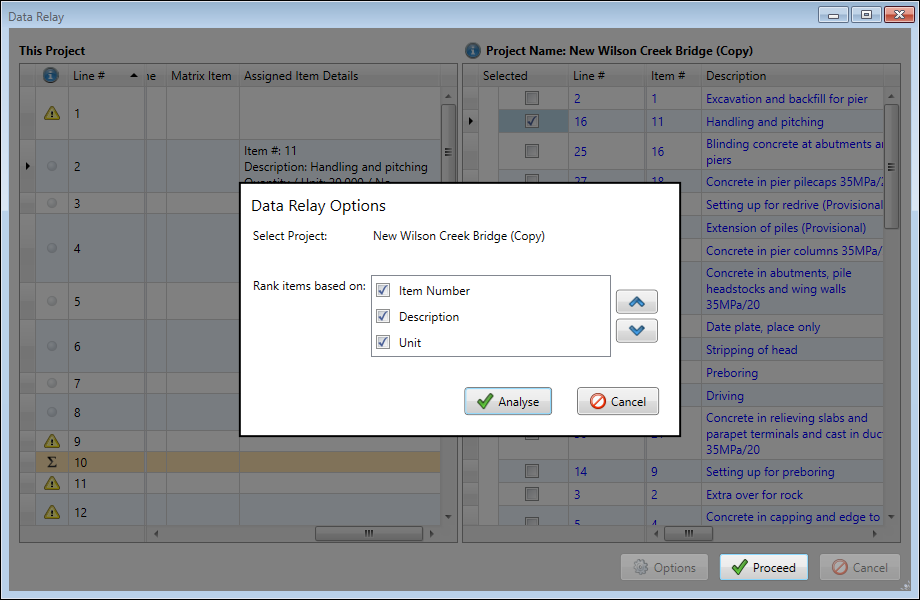 Once selected, the Item information will be populated into the Assigned Item Details column in the Local Item's grid. This will allow you to see which items are being populated in the current analysis. Once the Proceed button is pressed, the data will be carried across and a Conflict Resolution window will be raised if there is any conflicting data.