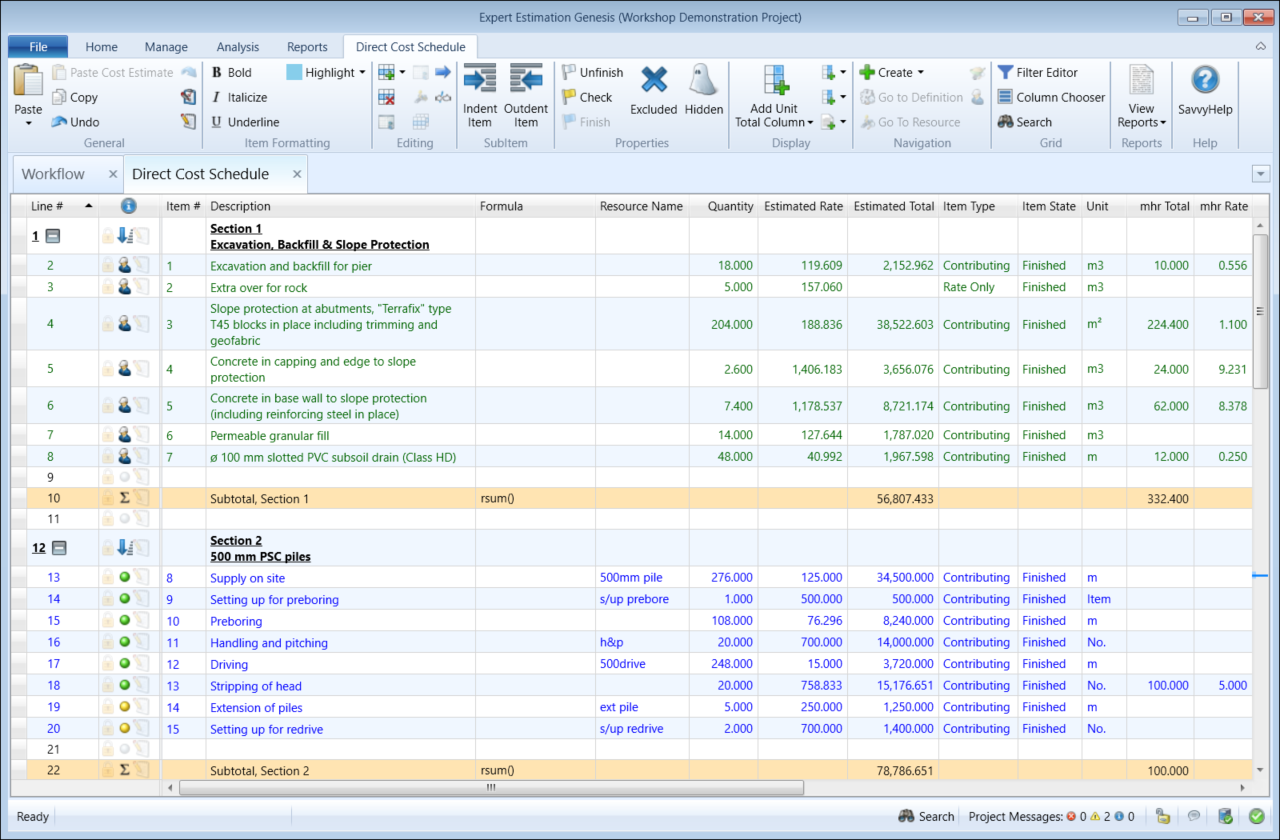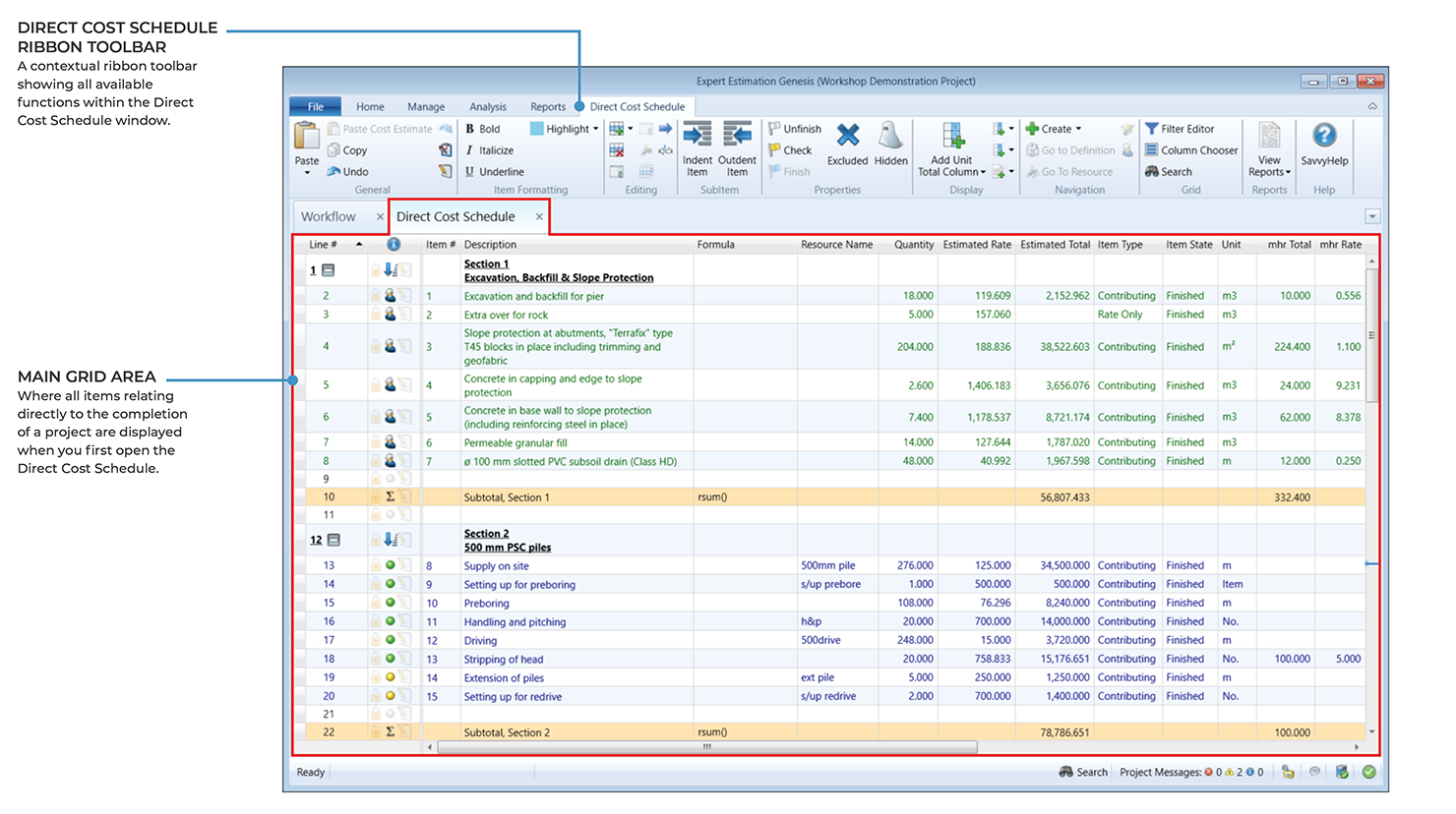 The contextual ribbon toolbar at the top of the window displays all the functions available to edit and modify the properties of Direct Cost Schedule items.