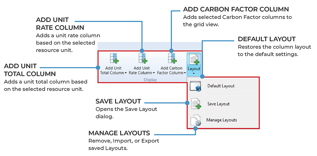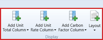 Displays a sub-menu that allows you to add specific carbon factor columns to the Direct Cost Schedule window. This column will display the Carbon Factor’s value based on the Cost Line. A column for each Carbon Factor can be added. Genesis edition only. |