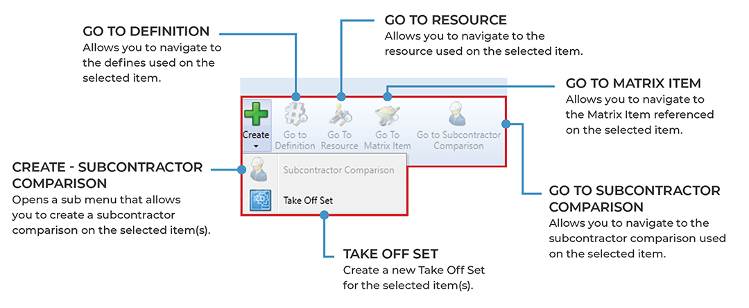 Within the Create sub-menu, there is an option to create a new Take Off Set quickly. The creation process is the same as if you were within the Take Off Sets window. However, upon creation, the new Take Off Set Calculation Sheet is opened to allow quick editing. Genesis edition only. |