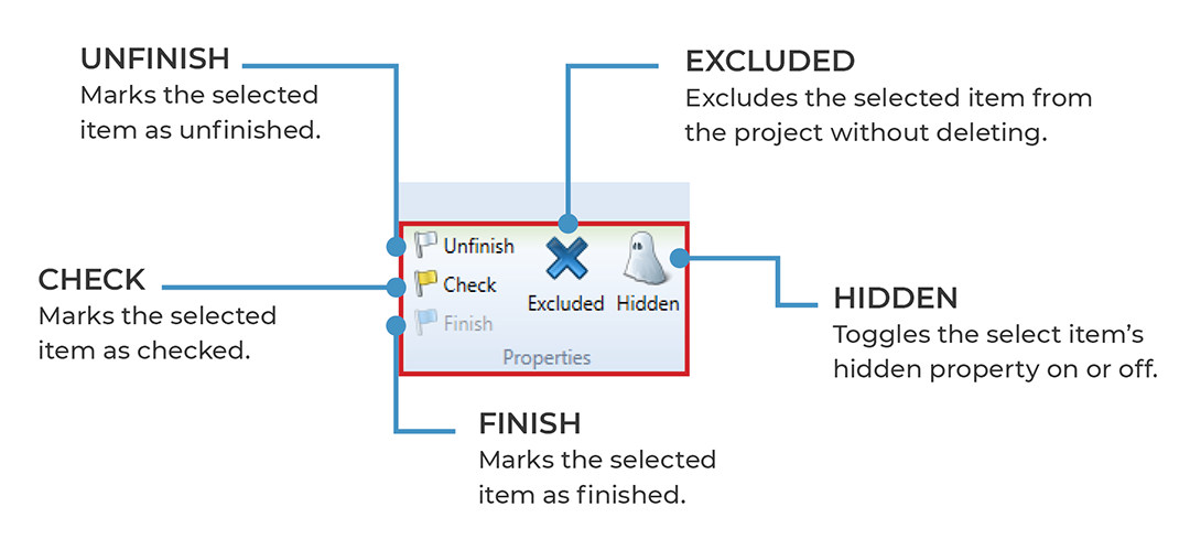 Changes the specified Line Item state to Finished. Finished items have been completely estimated and can be included in all calculations. For more information see Item States. When the item state is set to Finished, you cannot change the cost estimate without first changing the status of the item to Unfinished. |