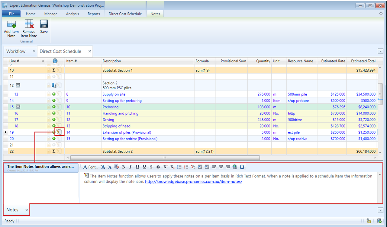 Item Notes displayed on the Direct Cost Schedule with formatted text, image, and hyperlink