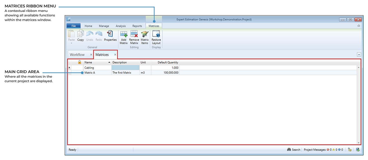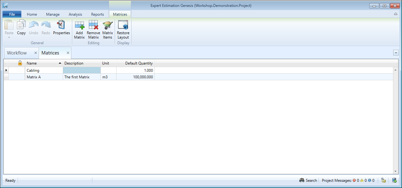 The main grid area displays a list of all available Matrices when you first open the Matrices window. A Matrix cannot be removed if one of the Matrix Items associated with it is used within the project.