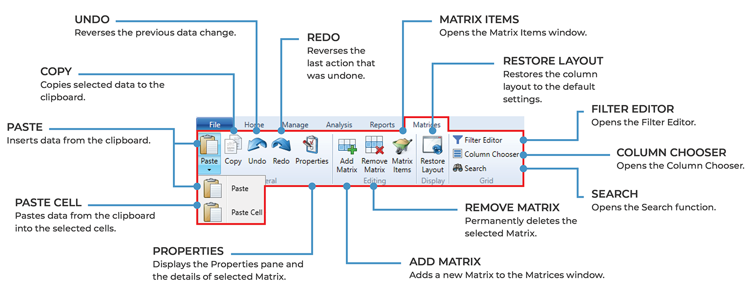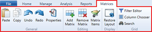 The contextual ribbon toolbar for the Matrices window provides you with access to all of the functions that allow you to add, remove, and manage the Matrices within your project.