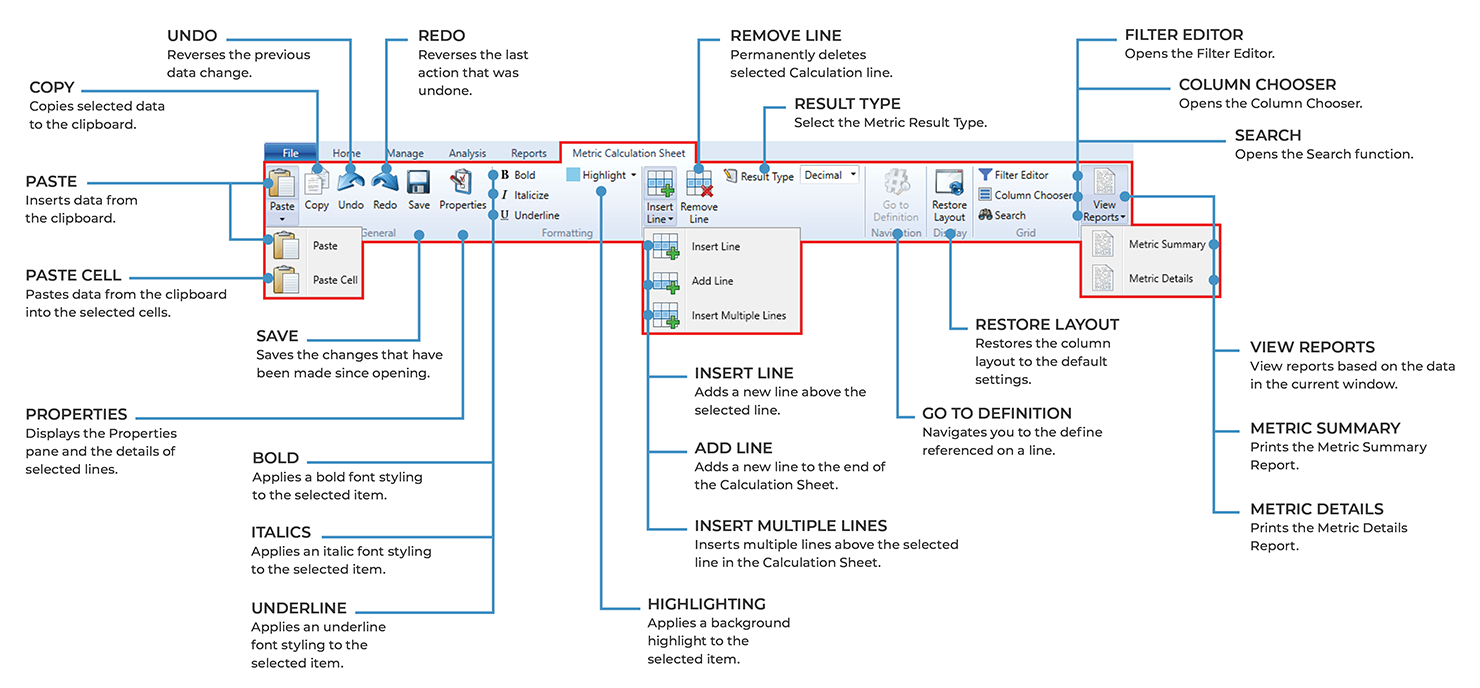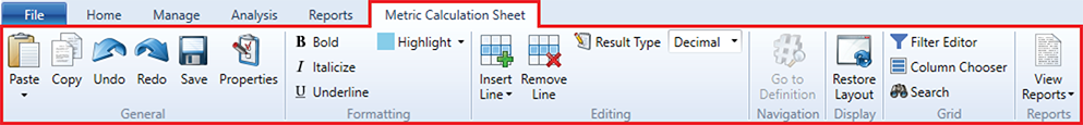 The contextual ribbon toolbar for the Metric Calculation Sheet window provides you with access to all of the functions that allow you to interact with the Metric Calculation Sheet for the current Metric within your project.