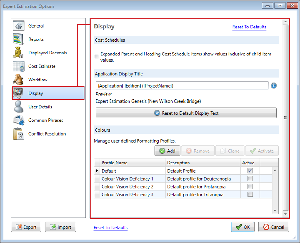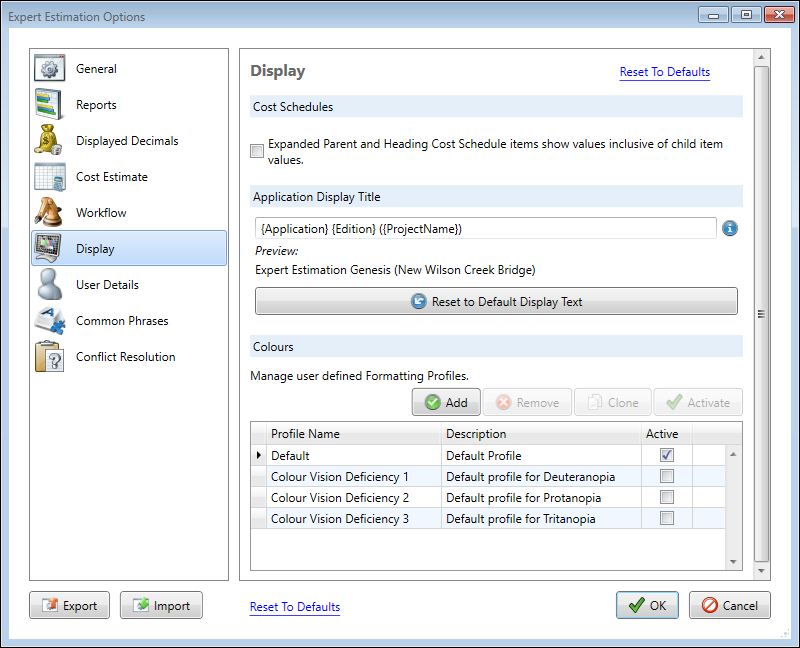 There are four profiles pre-loaded into Expert Estimation. These are the default Expert Estimation colour style, a Deuteranopia style, a Protanopia style and a Tritanopia style. Any of the pre-loaded styles can be modified at any time.