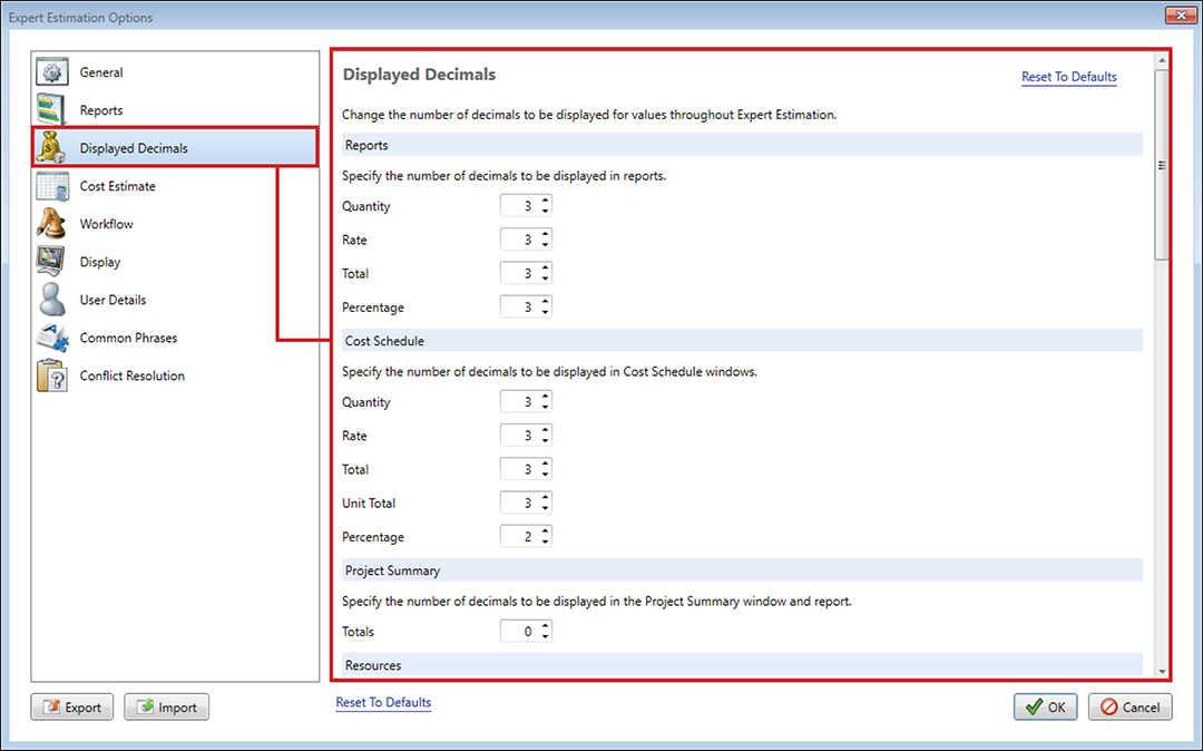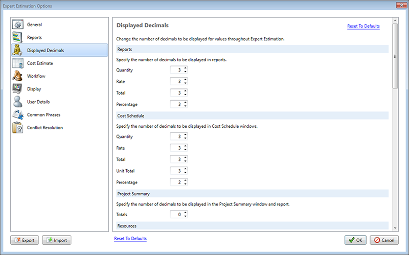 The Displayed Decimals section of the Options window contains settings relating to the number of decimals shown for values throughout the program.