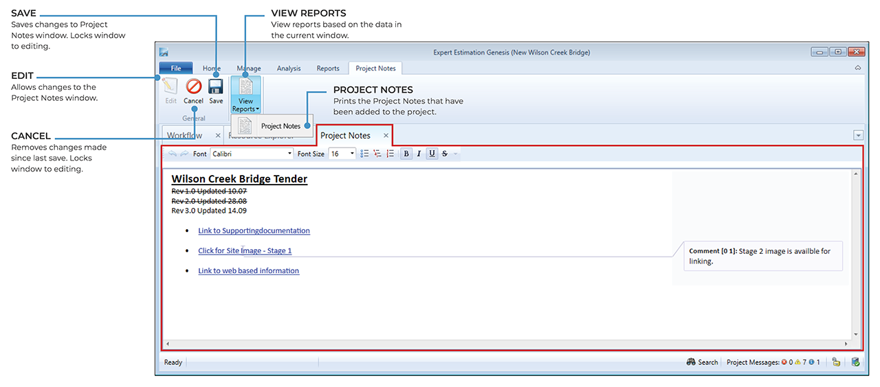 Users can add or edit information in the Project Notes window by clicking the Edit (