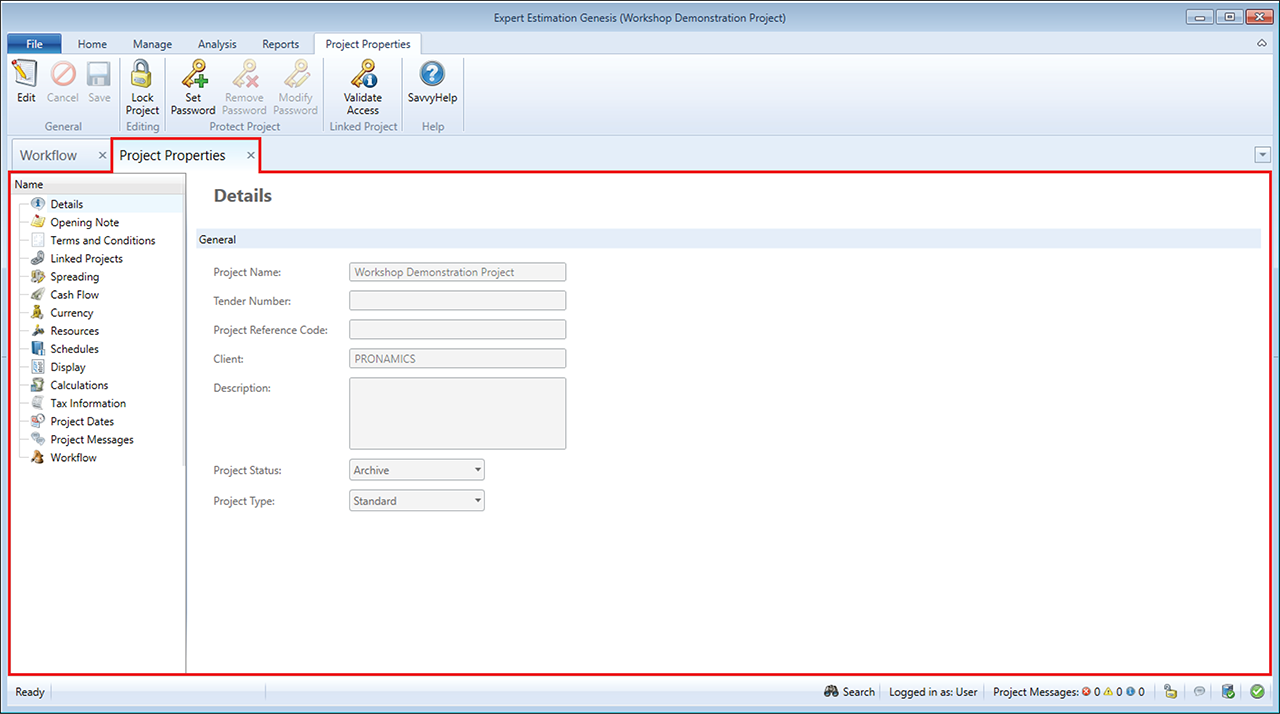 When opening Project Properties, the Details tab opens, which lists the general metadata about a project. The Project Properties - Ribbon Toolbar displays at the top of the window and contains all available functions within the window.