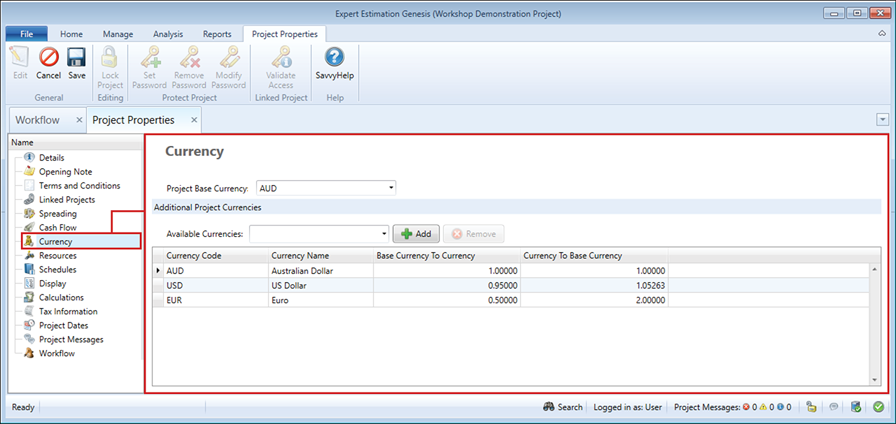 Additional project currencies will need to have their conversion rates set after being added. The Project Base Currency conversion rates cannot be modified, nor can you remove it from the project.