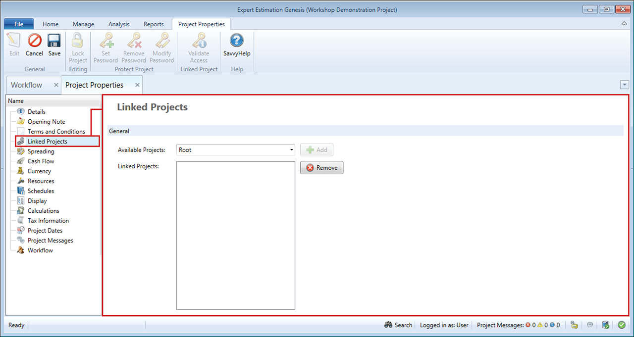 Lists the projects that are linked to the currently opened project. Links can be removed by highlighting a project in the list and selecting the Remove button. |