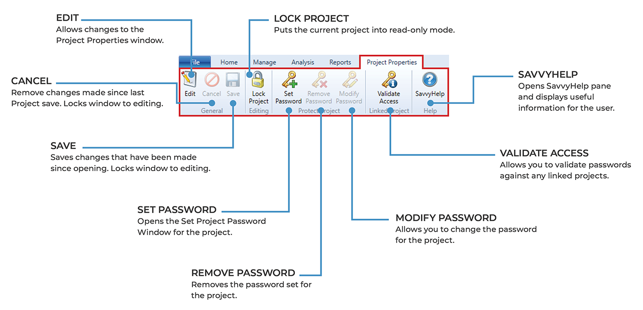 Clicking the Save button saves changes made to the Project Properties window. Similar to the Cancel button, this also locks the window from being edited until the Edit button is reselected. |