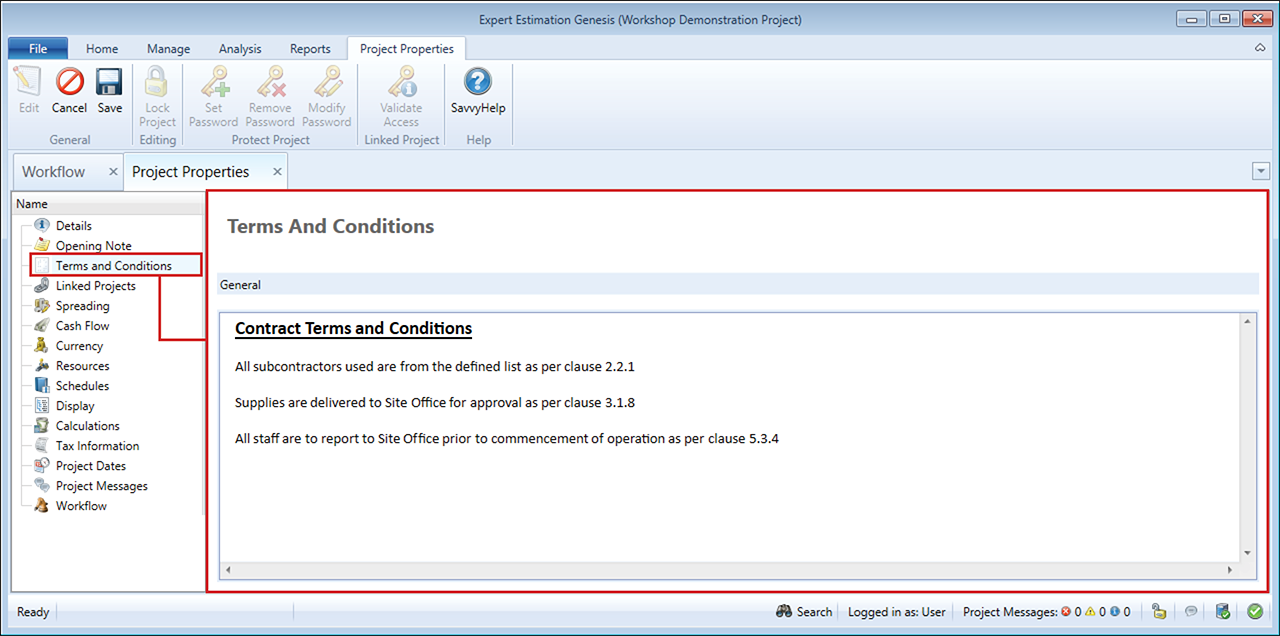 Project Properties - Terms and Conditions