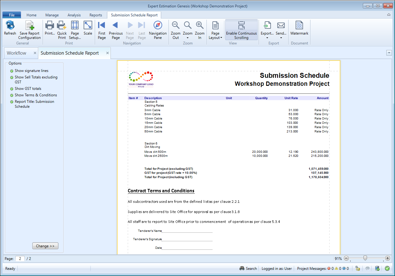 Once your Terms and Conditions have been saved, they can be appended to the end of the Submission Schedule report.
