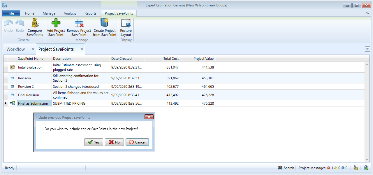 When Creating a Project based on a SavePoint with a Project Backup (including previous SavePoints), you have the option of including previous Project SavePoints in the new project. This option appears as a dialog box displayed after clicking the Create Project from SavePoint ribbon toolbar item.