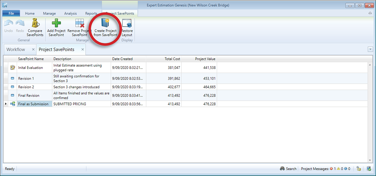 The Create Project from SavePoint action in the Project SavePoints window allows you to create a new project from the currently selected SavePoint. This gives you the ability to return to a previous point in time of the project and take a new direction with the tender without having to revert values manually.