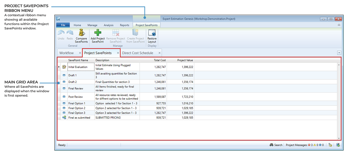 During the lifespan of a project, it may be advantageous to save a point in time revision of the project at a particular stage. The Project SavePoints window allows you to take a snapshot of a project at any stage during the development of your tender. If for any reason you need to revert a project back to a particular point in time, you can use Project SavePoints to restore the project.