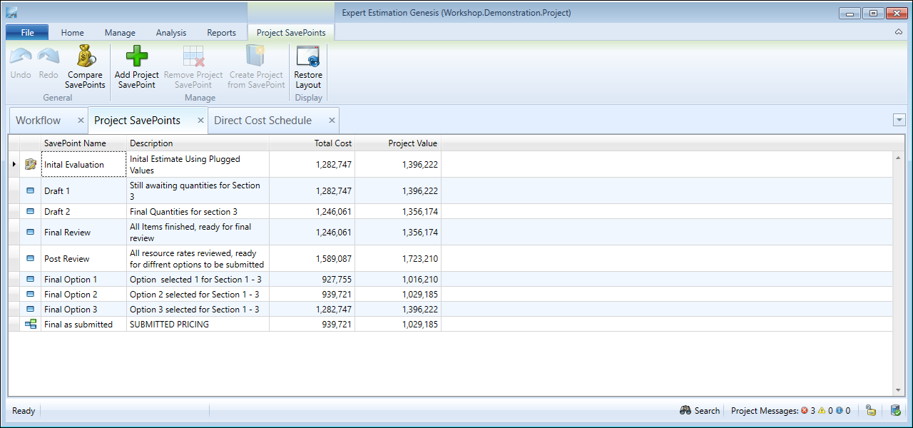 Project SavePoints can be used in a variety of ways: from analysing project values over time, through to restoring a project in its entirety from the time a SavePoint was made. This flexibility has been made available by allowing you to determine what a SavePoint should include.