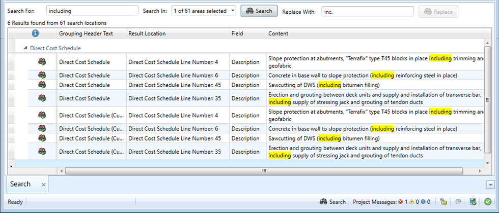 Search results are presented in the main table below the search fields. By default, results are grouped per result location (Direct Cost Schedule, Resource Explorer, Direct Cost Schedule – Cost Estimate, etc.) and display the text that was found with the keywords highlighted. You can navigate to the location of the resulting text by double-clicking on the row you wish to view.