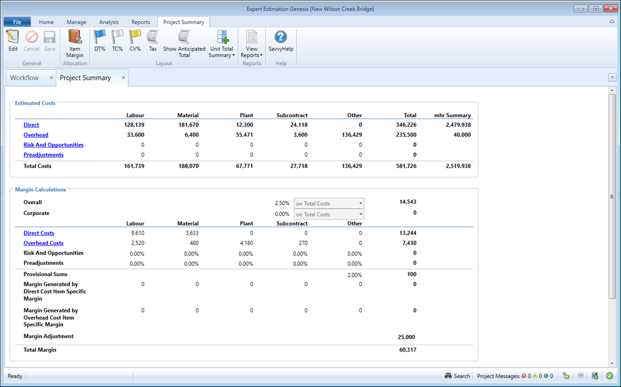 This window acts as both an analysis of project values as well as a configuration area for the available margin values.