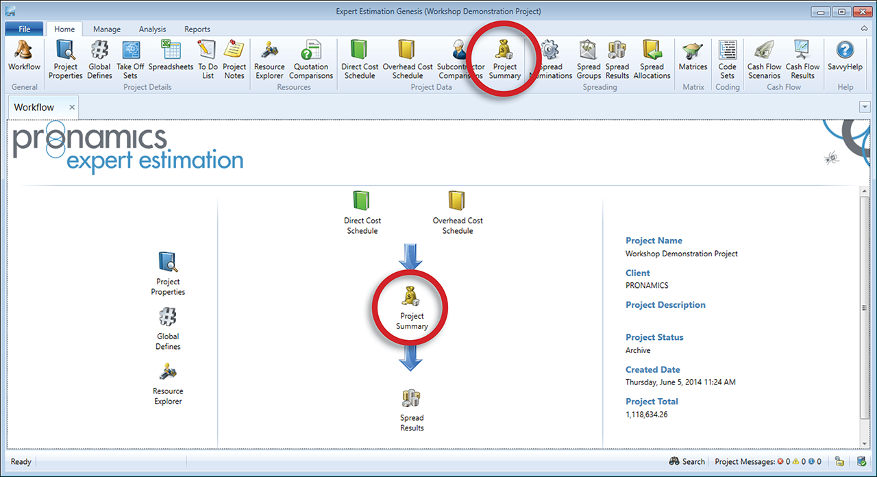 A great way to see how project totals are progressing while building a schedule is through the Project Summary. This window allows for an up-to-date analysis of project costs, ancillary values, and defined margins. These values are combined to generate the overall project total.