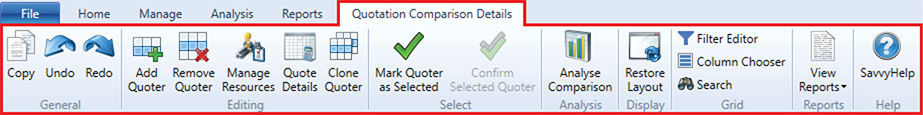 The Quotation Comparison Details contextual ribbon toolbar enables access to core window functions.