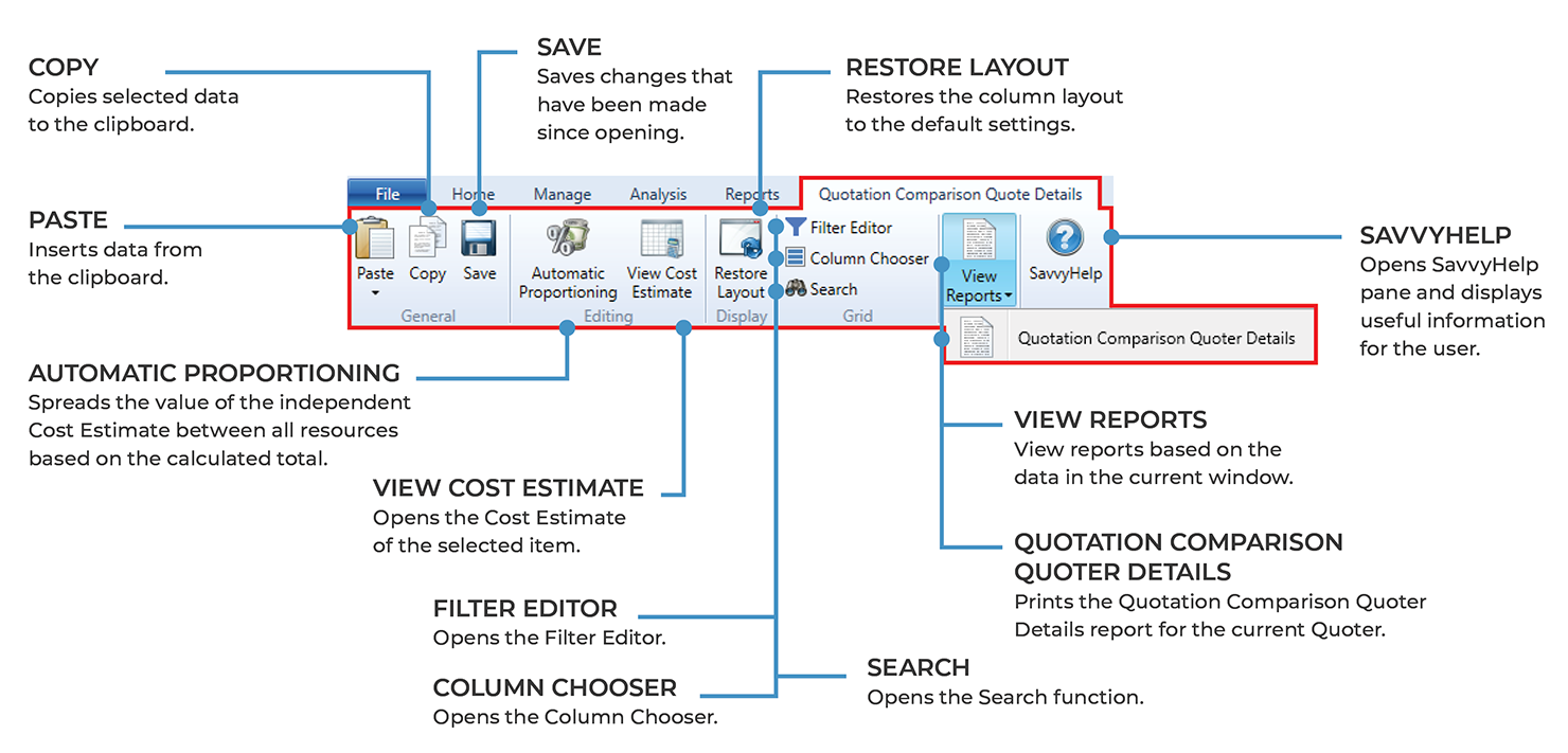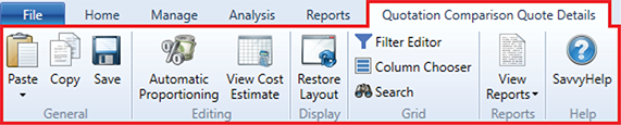 The contextual ribbon toolbar for the Quotation Comparison Quote Details gives you access to all the functions that are specific to managing the information within the Quote Details window.