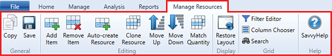 The contextual ribbon toolbar for the Quotation Comparison Resources window gives you access to all the functions specific to managing the Resources used within a Quotation Comparison.