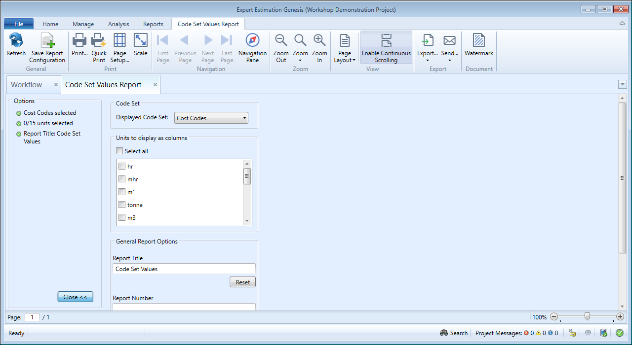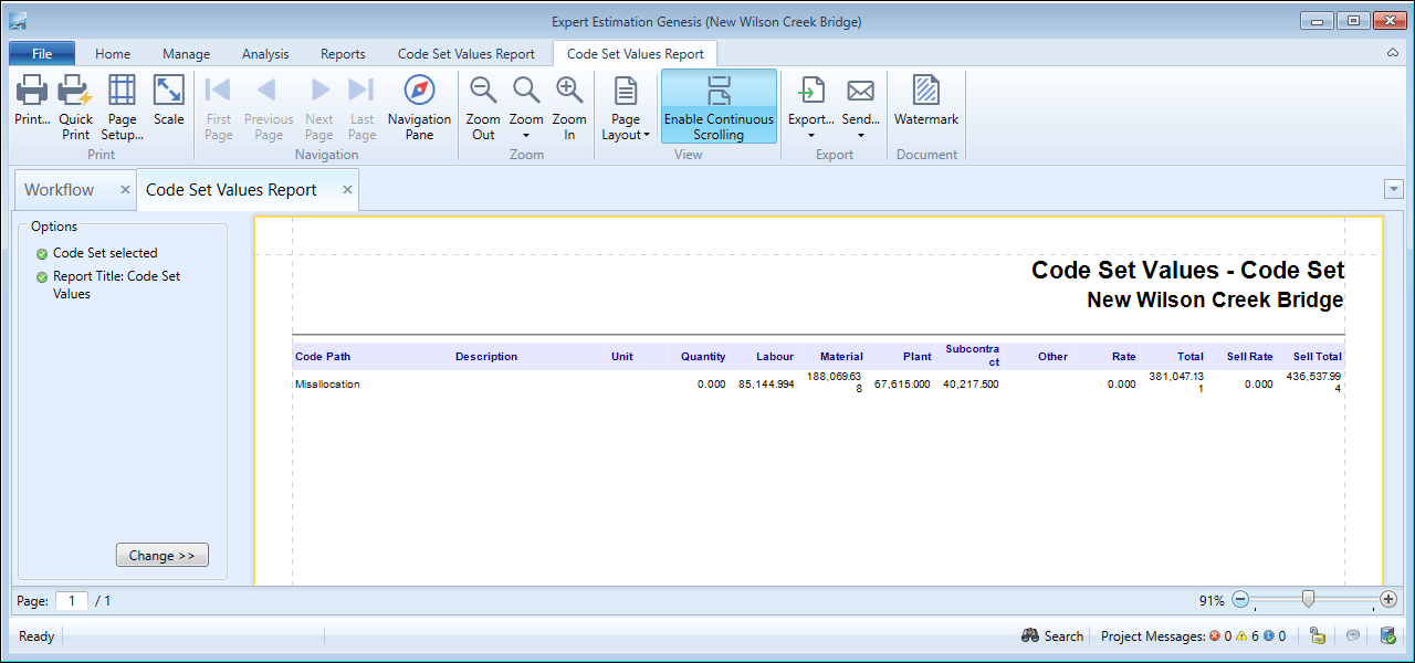 The Code Set Values report provides a printable summary for all the codes used within a Code Set. This allows for quick analysis of the Resource Type totals calculated for each code as well as their Total Cost and Sell values.