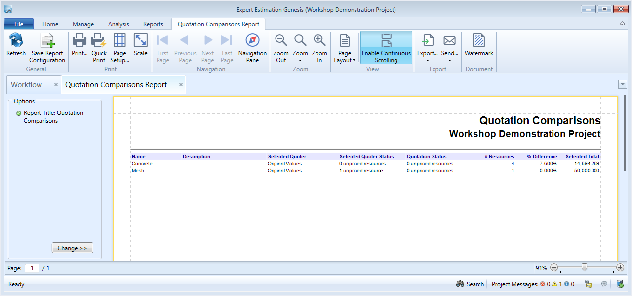 The Quotation Comparison report provides a print-friendly version of the details presented in the Quotation Comparisons window. This allows for a summary of each Quotation Comparison to easily be reviewed and distributed to others.