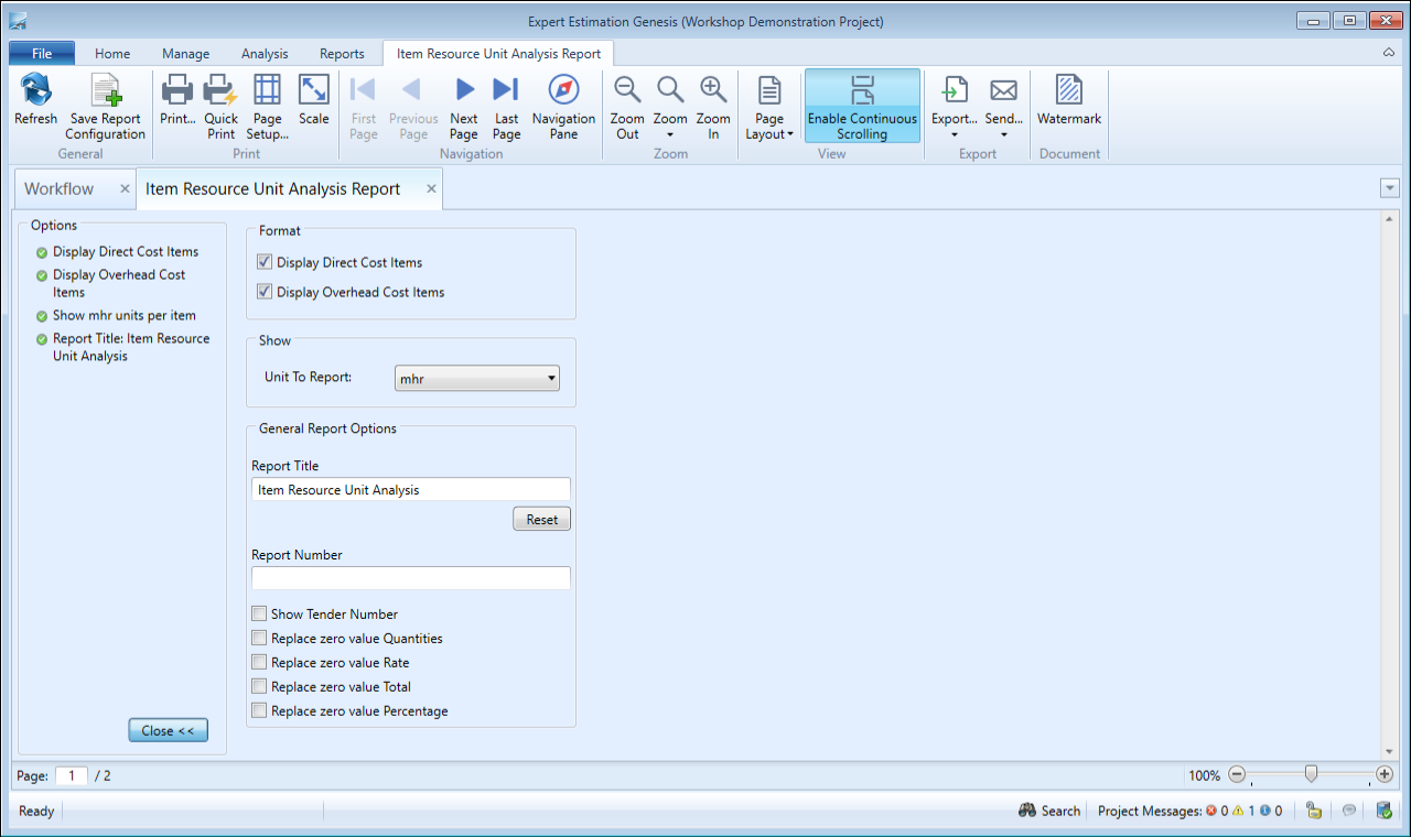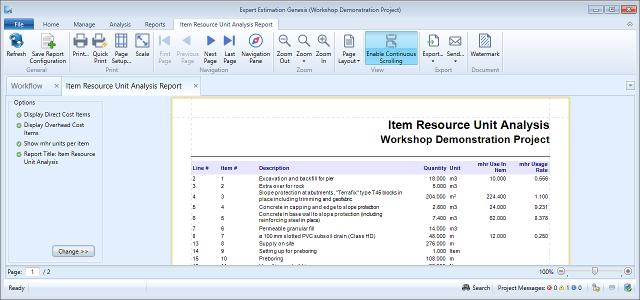 The Item Resource Unit Analysis report provides a printable summary of the usage and usage rate for a given resource unit for both Direct Cost and Overhead Cost Schedule items.