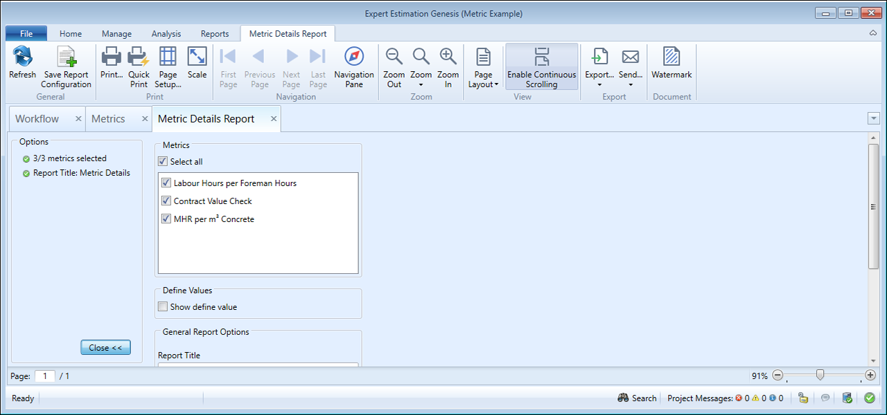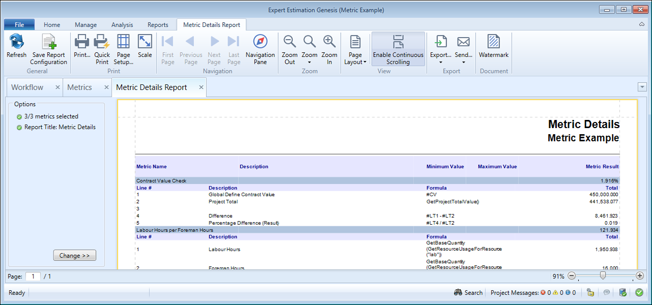 The Metric Details report provides a printable breakdown of the Metrics in the current project and their calculation sheet information.