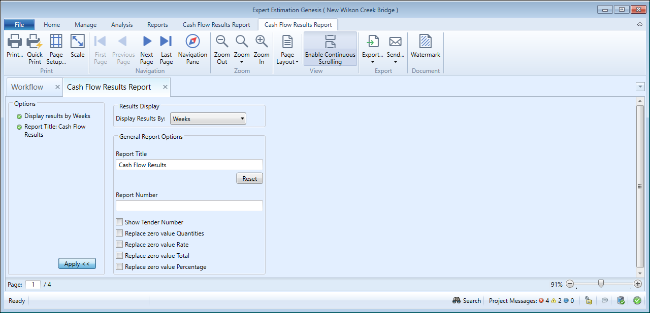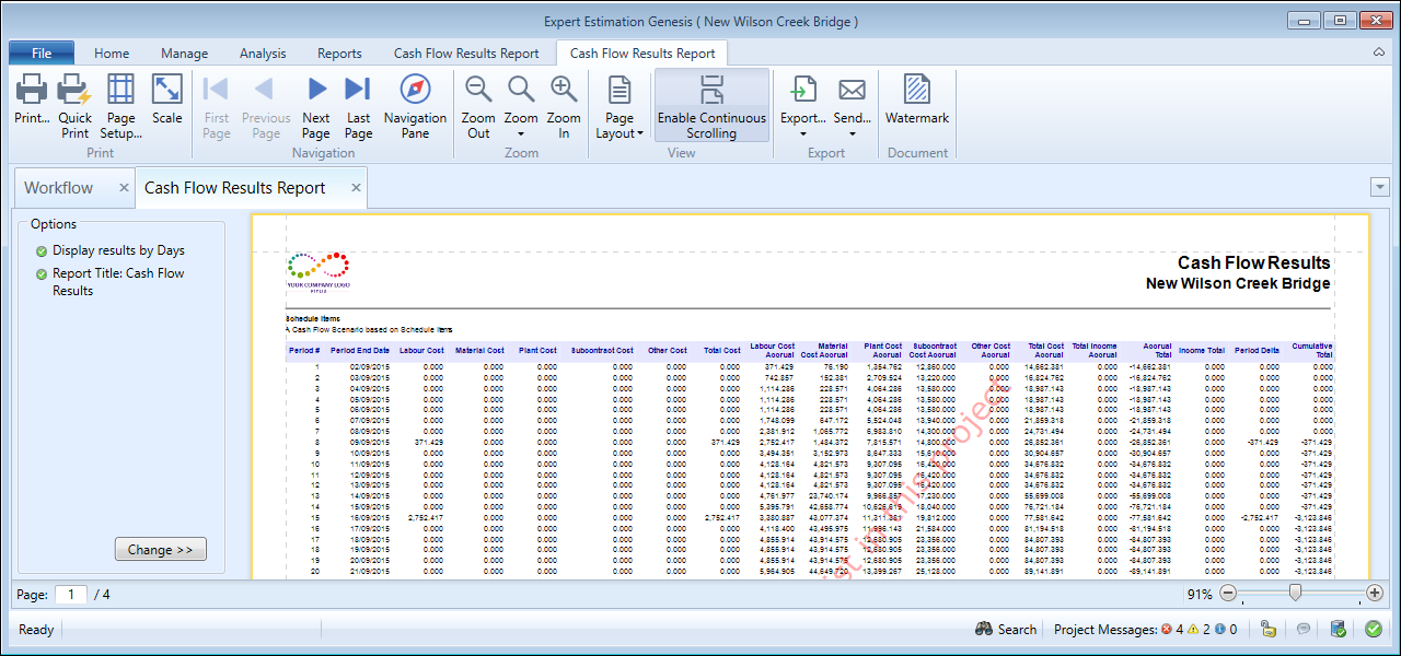 The Cash Flow Results report provides a print-friendly summary for the currently active Cash Flow Scenario. This report allows you to analyse the results of the cash flow calculation.