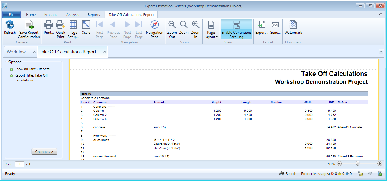 The Take Off Calculation report provides a printable breakdown of the calculation sheet behind each Take Off Set within the project. This allows you to quickly analyse all the calculations behind the value of your projects Take Off Defines.