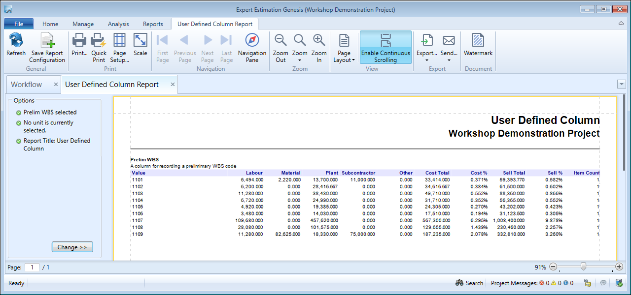 - Cost % (the percentage of the combined total of Direct and Overhead that is the specific User Define column value)