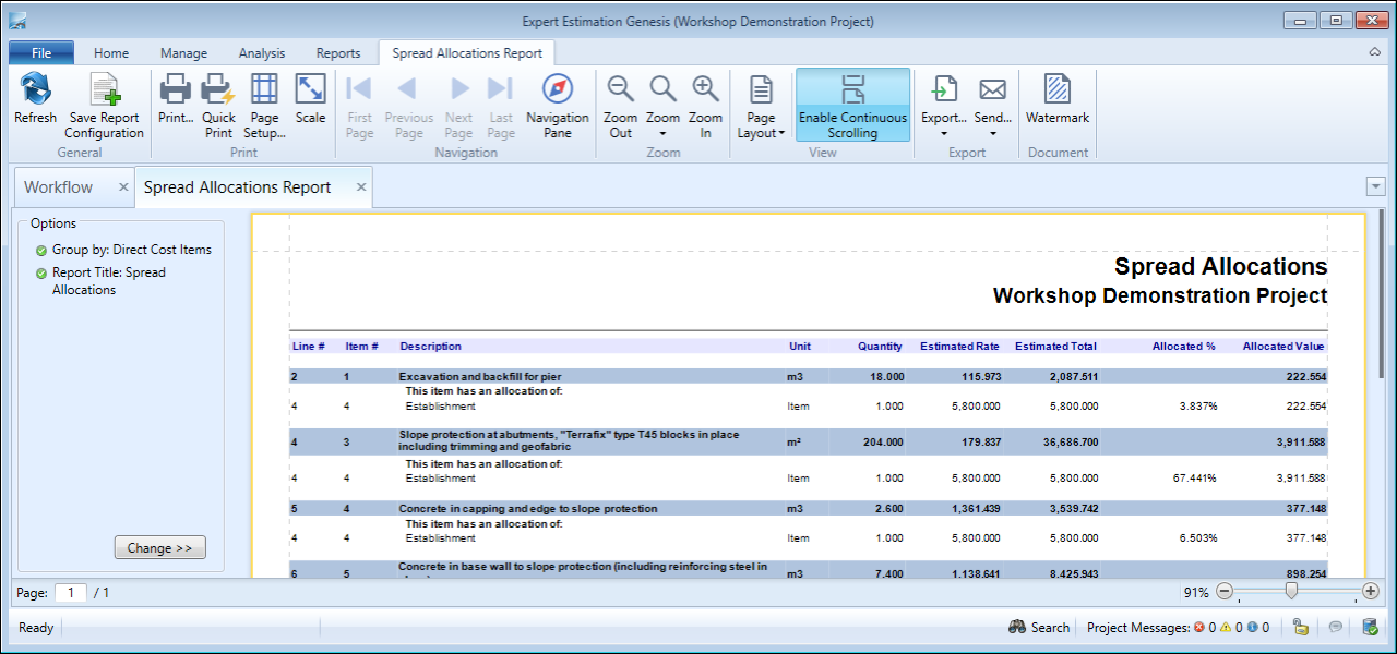 The Spread Allocations Report provides a print-friendly breakdown of how all Overhead and Hidden items have been directly allocated. This report allows you to analyse and verify the percentage and allocation value of all items.