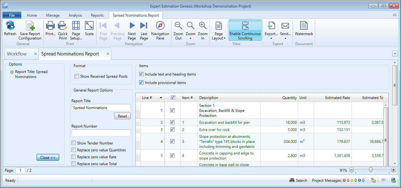 The Options section will allow you to easily include / exclude any Heading or Provisonal items from the report, the Grid Section contains checkboxes allowing you to include or exclude individual items from the report.