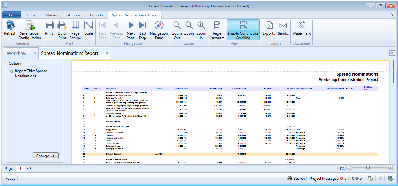 This report provides a print-friendly version of the data displayed in the Spread Nominations window. This allows the nominations applied to items within a project to be easily reviewed.