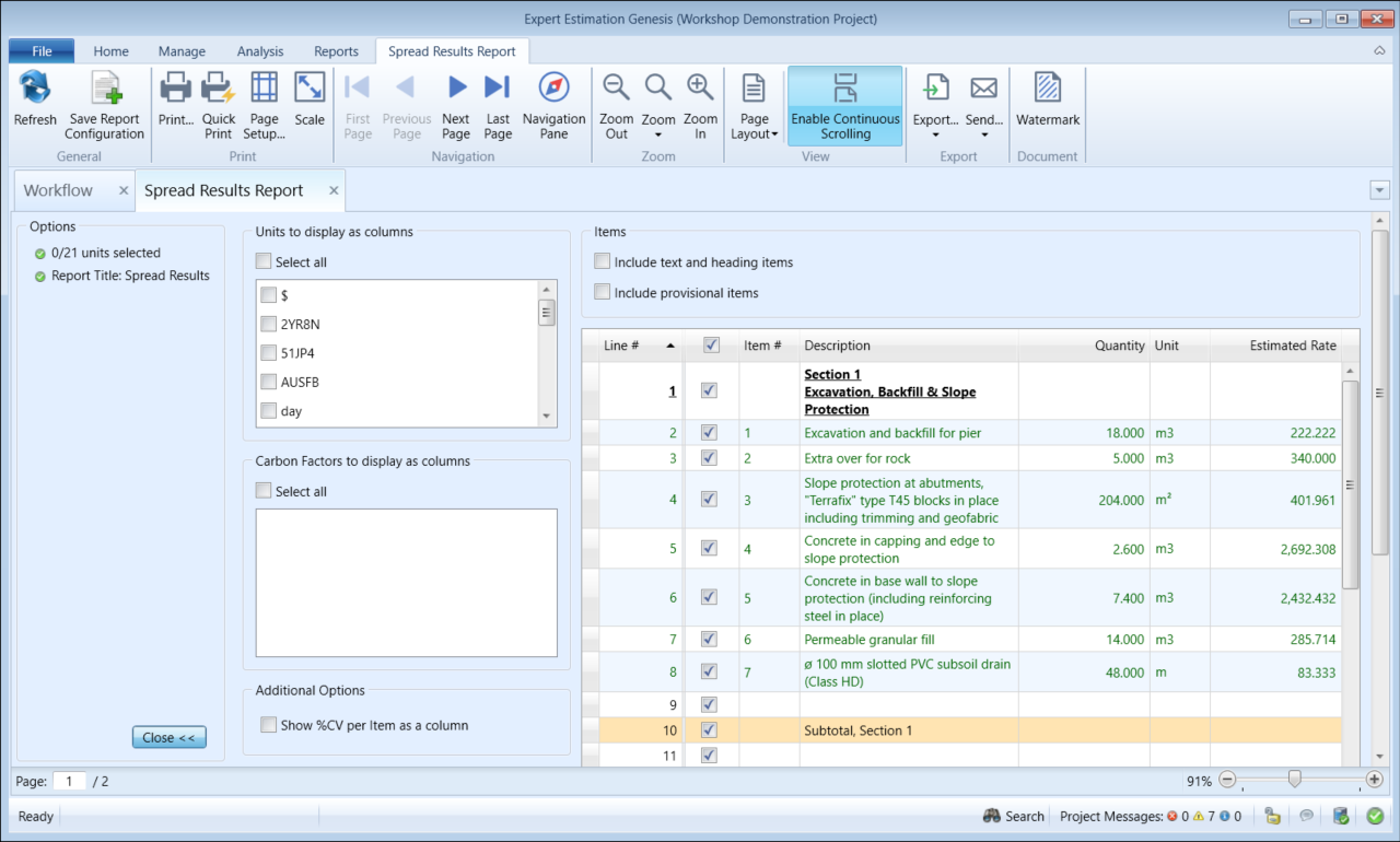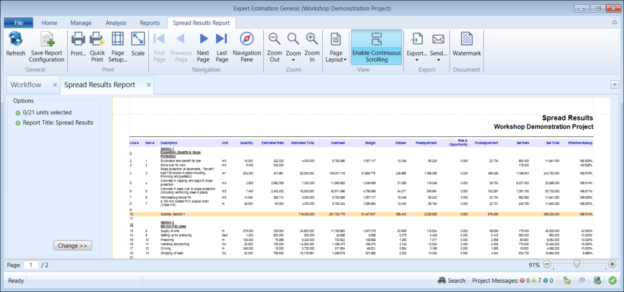 The Spread Results Report provides a print-friendly breakdown of Direct Cost Schedule items and how their sell values are composed as a result of the spread calculation. This report allows you to analyse and verify the results of the spread calculation.