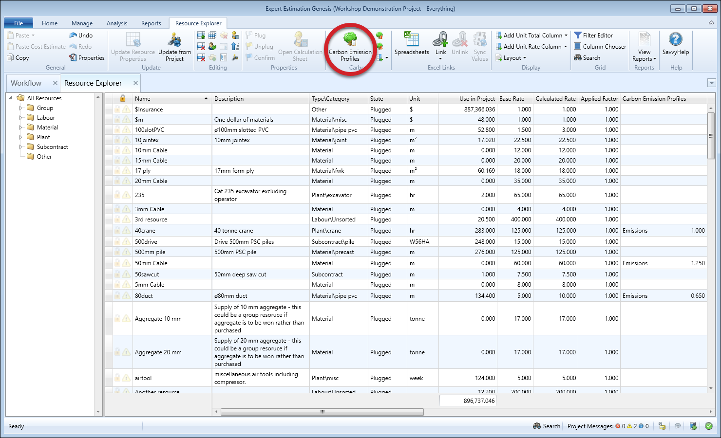 Once Profiles are created, they can be assigned to Base Resources via the Carbon Emission Profile column in the Resource Explorer. Using the Add Carbon Factor Column function, columns can be added to the Resource Explorer grid to display individual Factors, group totals or Carbon Total.