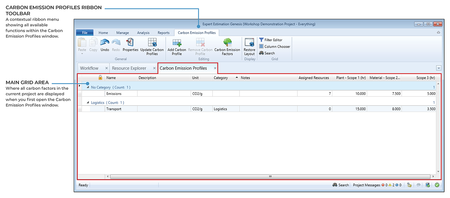 Carbon Emission Profiles are the source of emissions data for a project. Each Profile contains a column for every defined Carbon Emission Factor, and these columns are populated with the quantity of emissions generated for that Profile.