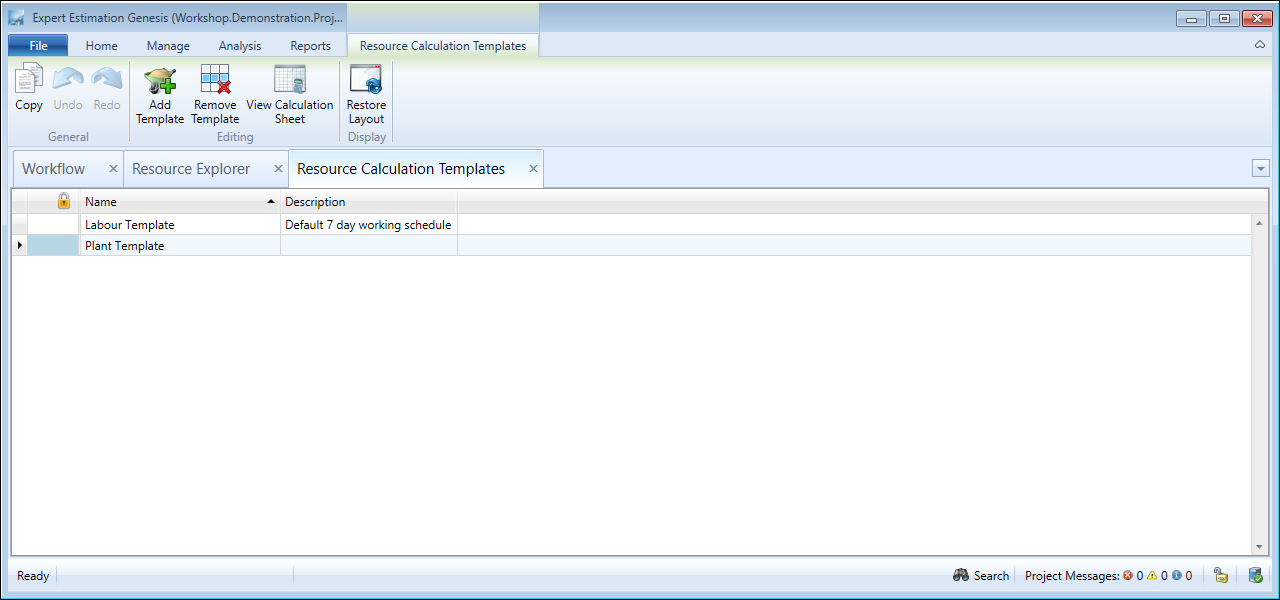 The main grid area is where all available Calculation Templates are displayed when you first open the Resource Calculation Templates window.