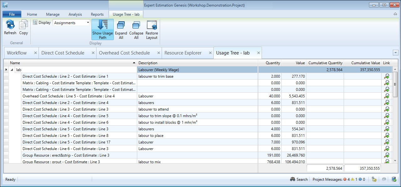 At each location that the resource is being used and contributing value to the project, you can see the quantity and value of the resource.
