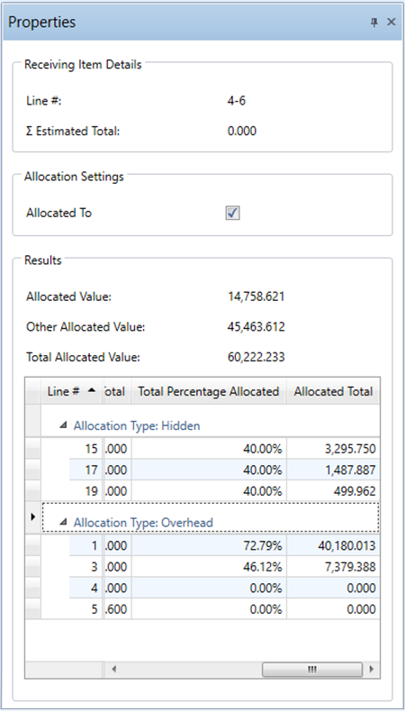 The Properties Pane for the Direct Spread Allocations window displays information for the Hidden and Overhead item that is currently being allocated. It represents the same data displayed in the Direct Spread Allocations window in a different format, having the benefit of providing summary information for multiple selected items alongside a breakdown of the items receiving other allocated value.